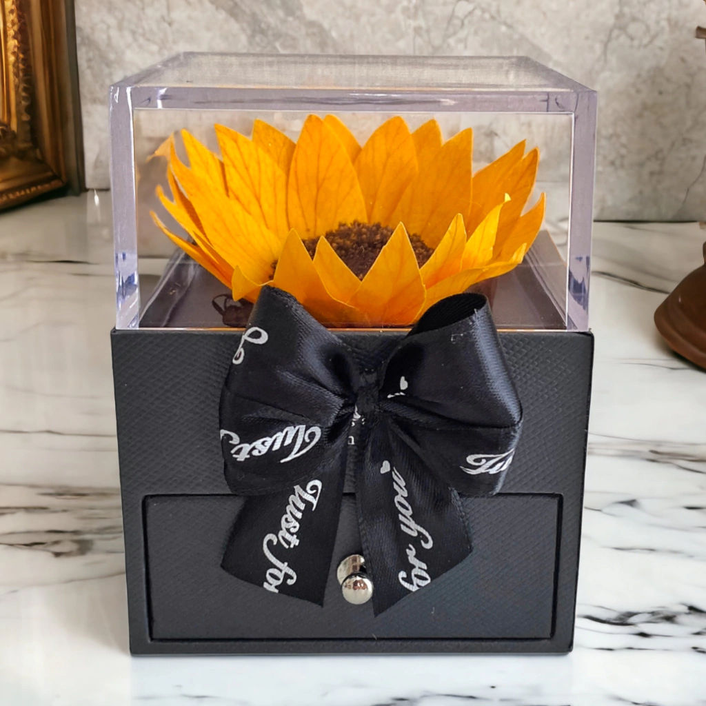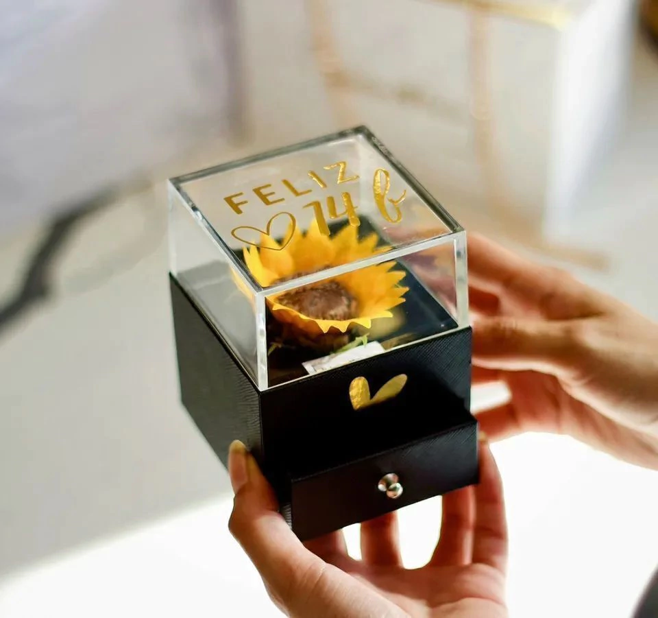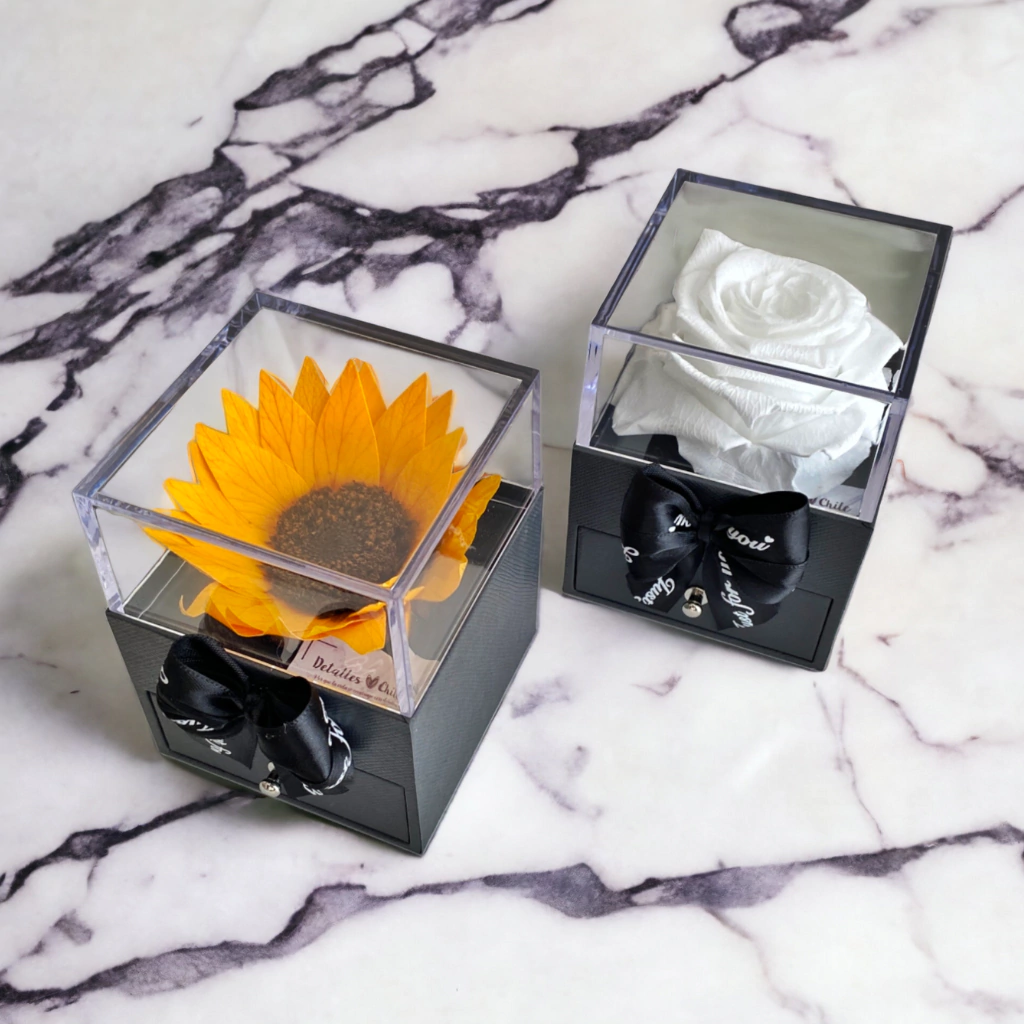 Un regalo único que combina la elegancia de un joyero con la belleza eterna de una flor natural preservada. Disponible en dos modelos: