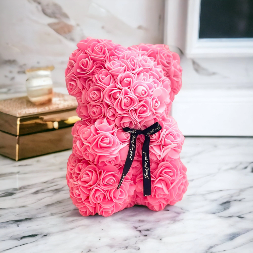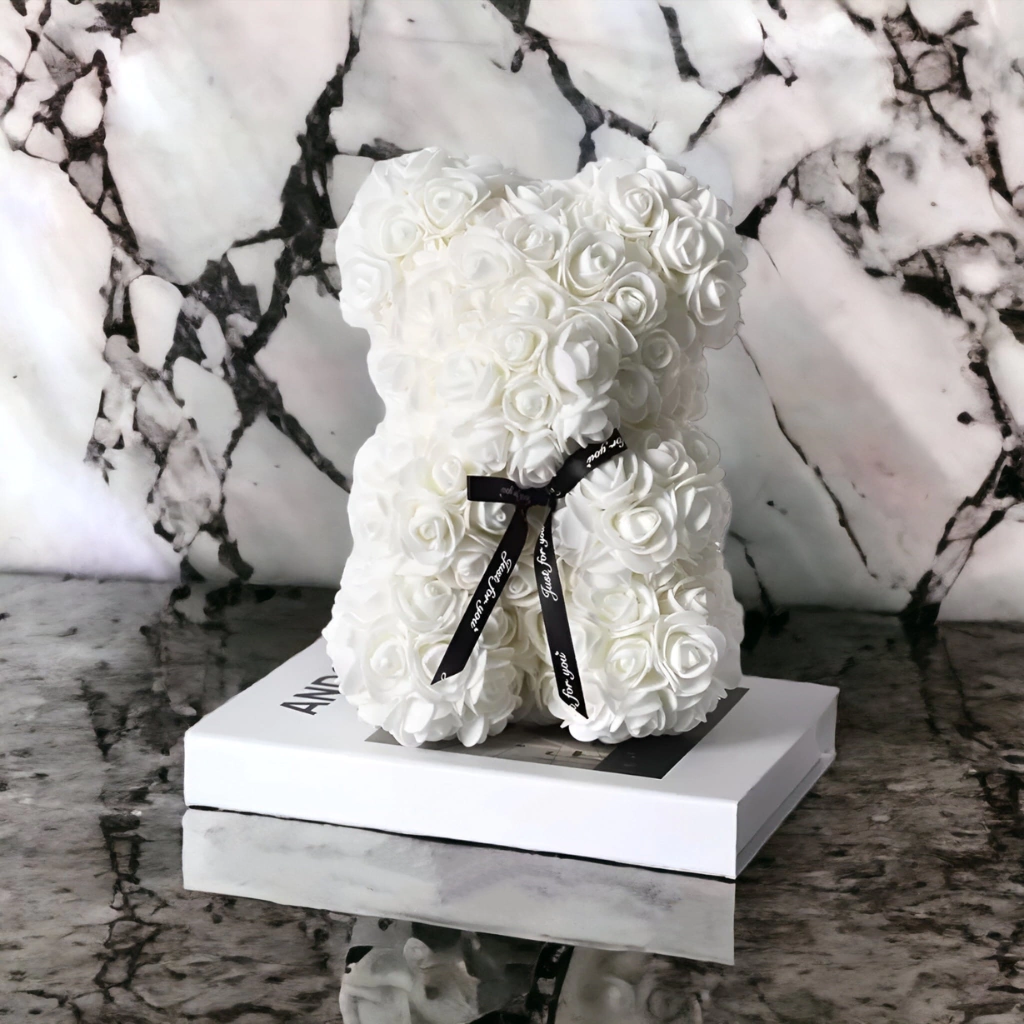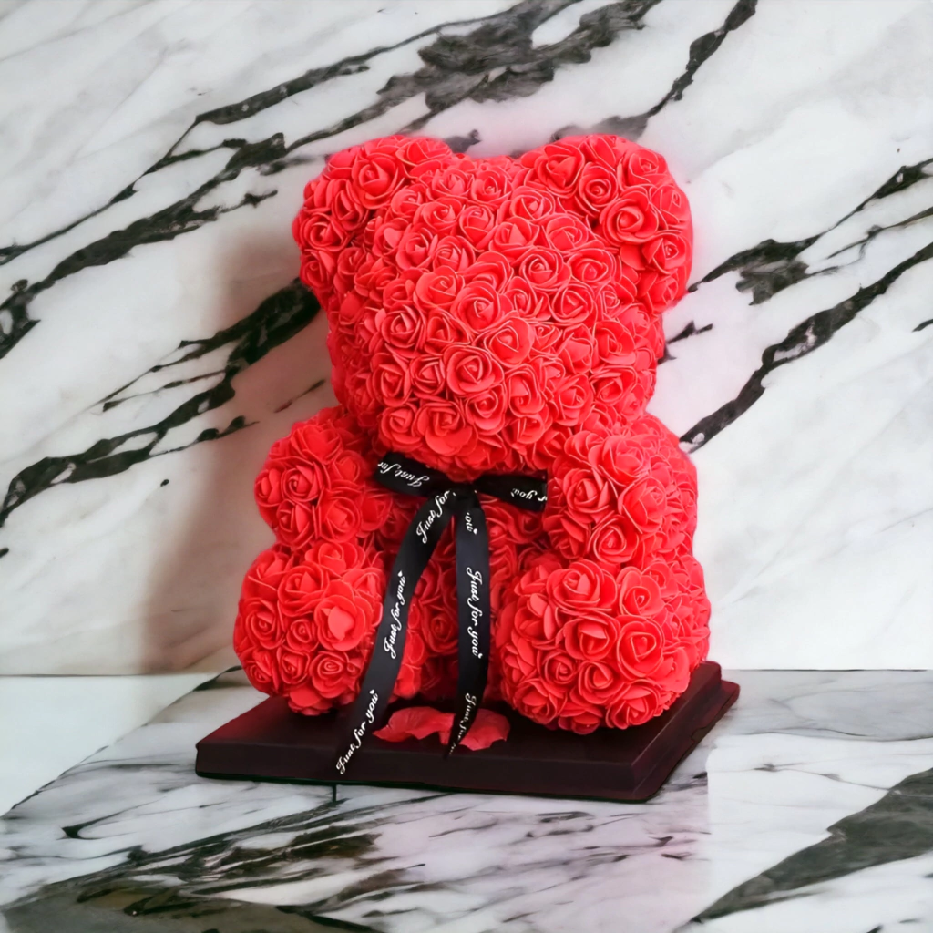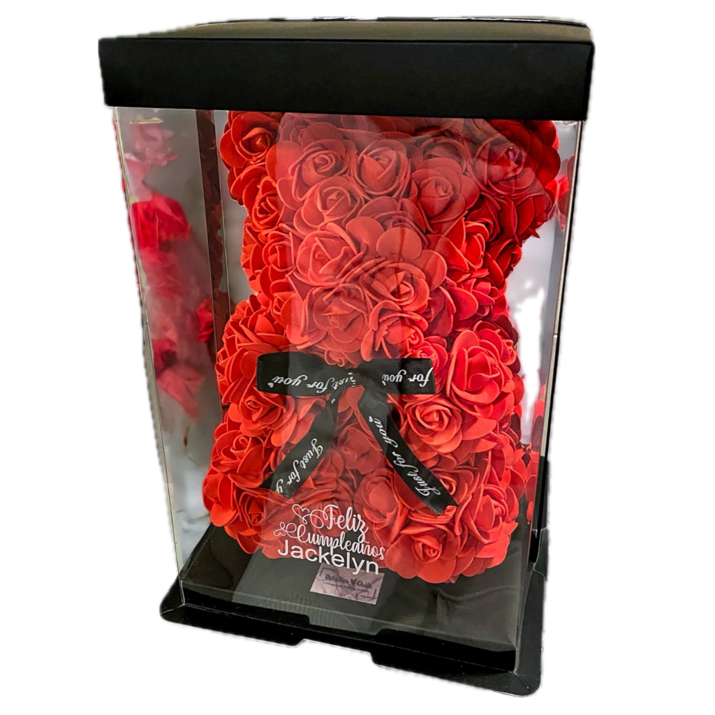 Regala un detalle tierno y elegante con nuestro Osito Teddy Bear, elaborado con rosas sintéticas premium, resistentes al polvo y la decoloración. Viene protegido en una caja cúbica transparente, que realza su belleza y le da un acabado único. Disponible en distintos colores vibrantes, perfecto para toda ocasión especial.